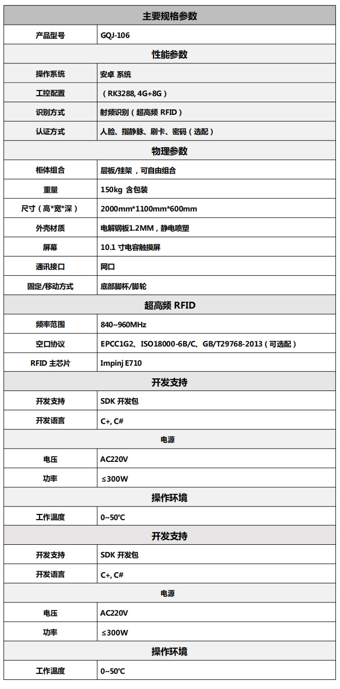 RFID智能工具柜是一款符合ISO 18000-6C国家标准协议的工具柜,基于RFID自动识别技术可实现对工器具的实时盘点、智能存取、过检提醒、实时查找、语言播报以及异常提示等功能。该产品可放在室内环境,或是安全的开放式半室外环境中,采用RFID智能识别技术,无人看管,可24小时运行,人机交流操作简便,互动感强、性能稳定。产品特点